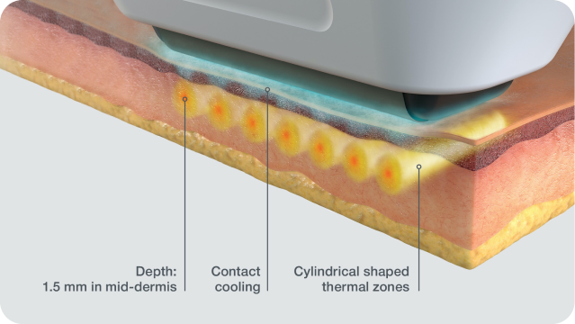 Proprietary Synchronous Ultrasound Parallel Beam SUPERB™ technology with integrated cooling Sofcool™, while ensuring no damage to the epidermis or to the underlying structures beneath the dermis